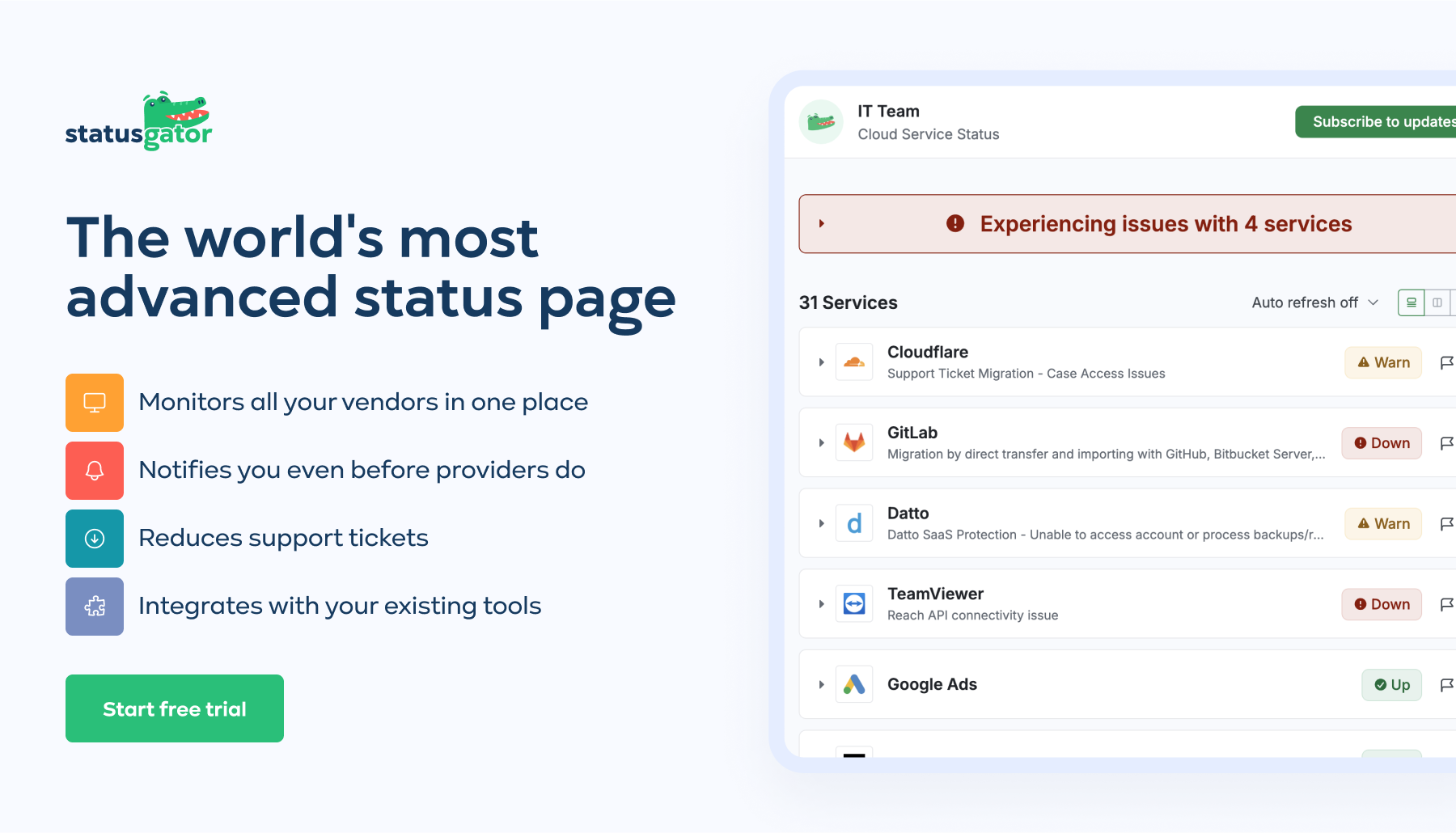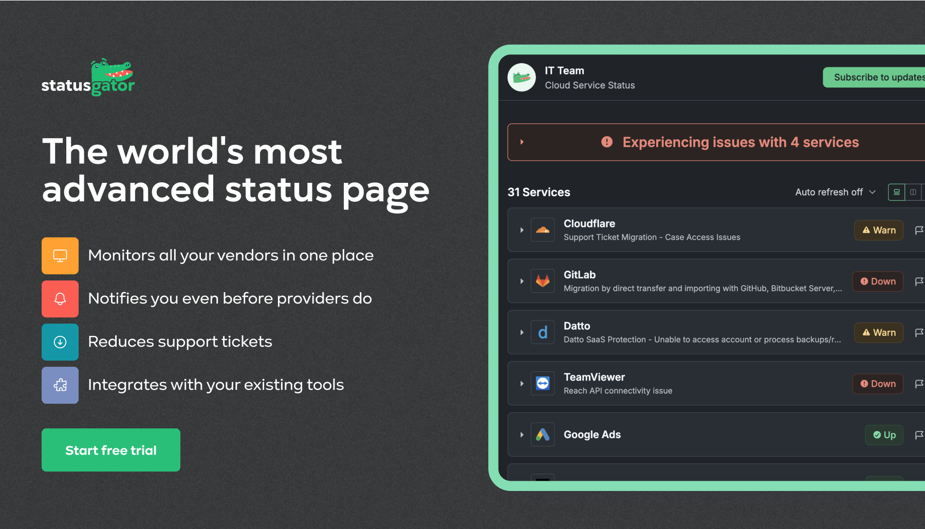 - Seamless Integration: With multiple integration options, StatusGator fits into your existing workflow, making it easier to manage incident communication without disrupting your processes.