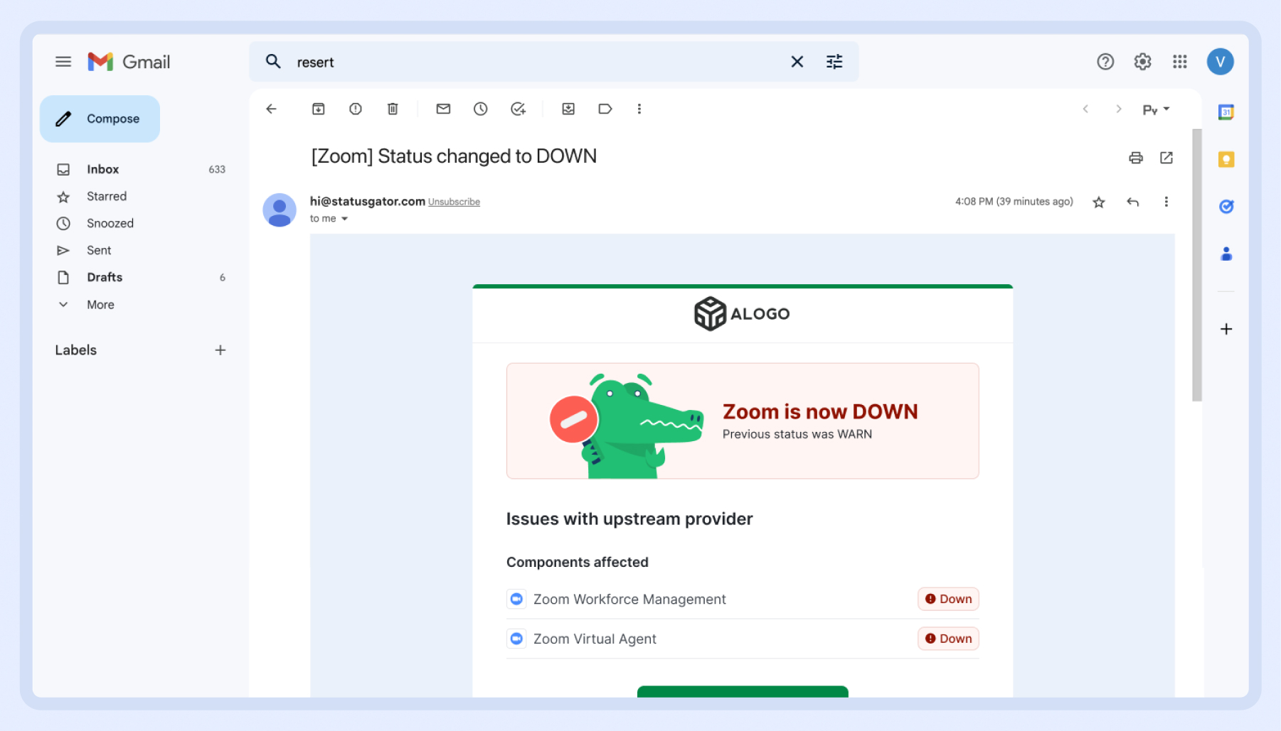 StatusGator supports custom email branding on our Enterprise plan and as an add-on to other plans, allowing your customers or end-users to get an email that has your organization logo and sends from your organization’s email address.
