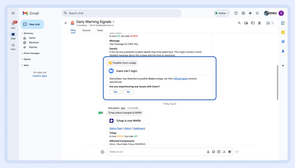 Good news – Early Warning Signals are now available in Google Chat! This means you’ll get real-time alerts about possible outages—before providers officially acknowledge them—delivered right where your team is already chatting and collaborating.