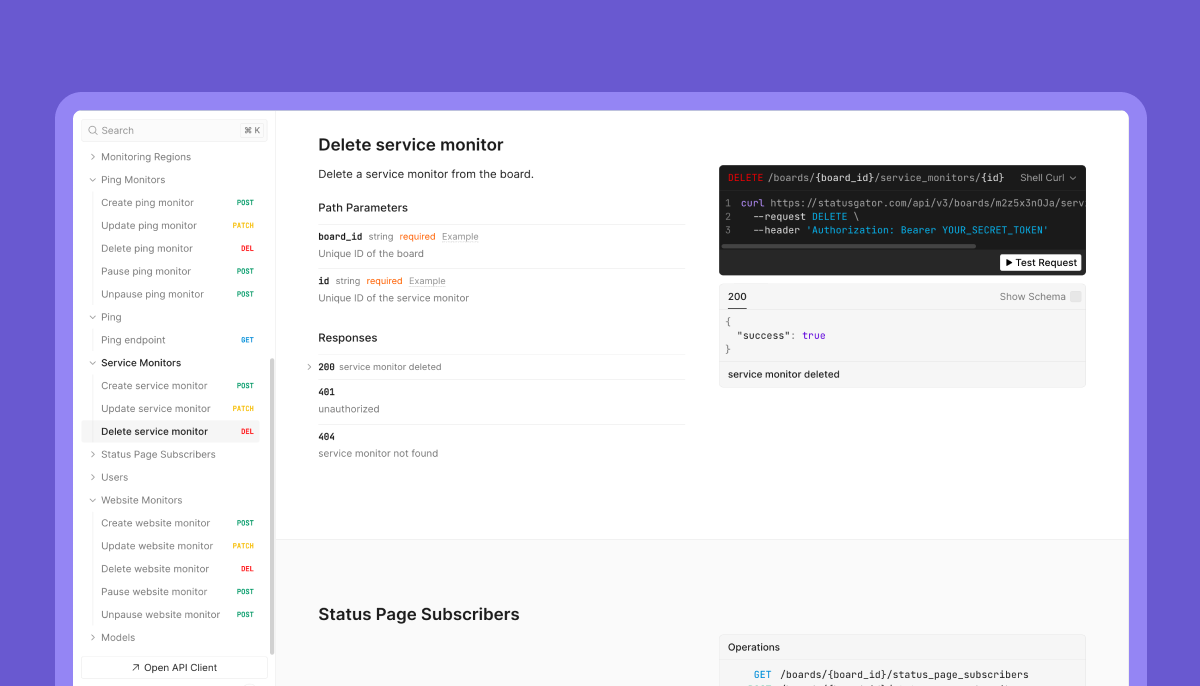 StatusGator’s API now supports deleting all monitor types, including service, website, ping, and custom monitors, making automation and cleanup easier.