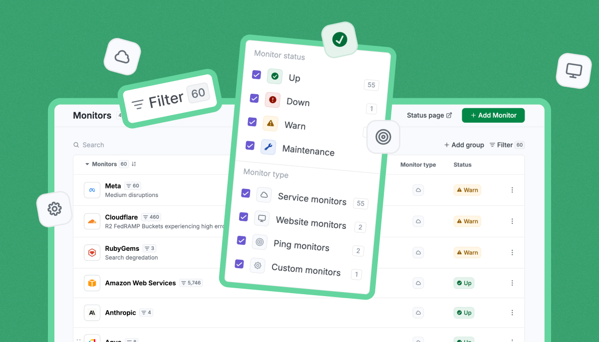 Filter your monitors by status and type to quickly find what matters. Easily narrow your list by Up, Down, Warn, Maintenance, or monitor category.