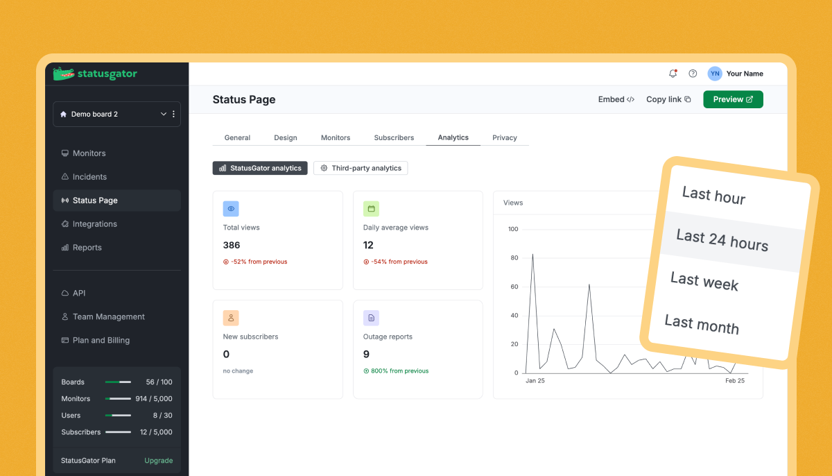 You can now view status page analytics across multiple time ranges, from the last 24 hours to the past year, for more flexible and actionable insights.