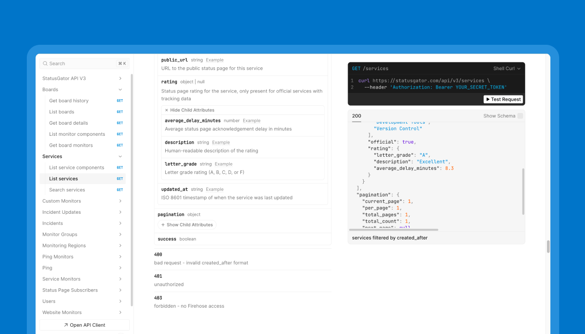 Service status page ratings are now available in StatusGator API v3, including letter grade, description, and average acknowledgment delay minutes for each service.