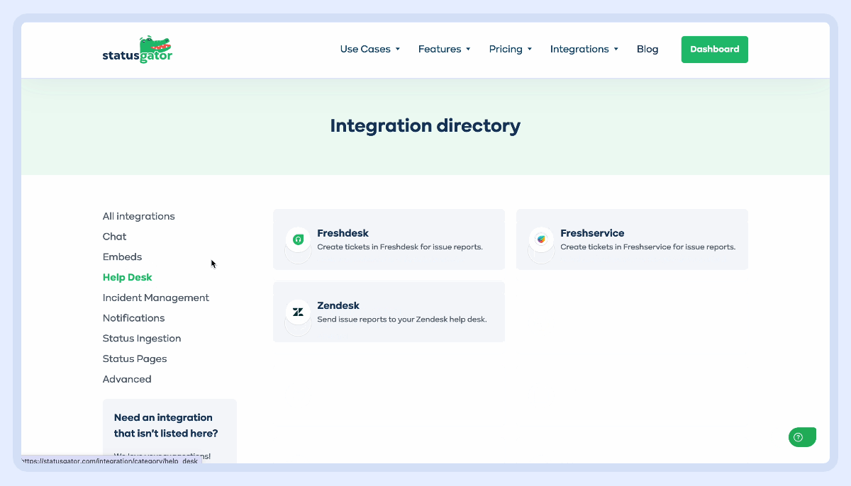 Keeping your team informed about service disruptions has never been easier. The StatusGator Integration directory, available in the Menu on our website, allows you to explore all the integrations we support in one place. From collaboration tools to incident management platforms, we help you integrate status updates seamlessly into your workflow.