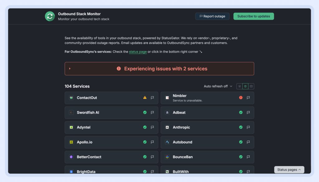 Since many of these services are deeply integrated with OutboundSync, any downtime or degraded performance can impact their customers’ workflows. Instead of leaving users in the dark, OutboundSync gives them one unified place to monitor third-party outages and subscribe to real-time alerts. Both OutboundSync and their customers can get advance notice of emerging outages with StatusGator’s Early Warning Signals, helping everyone stay ahead.