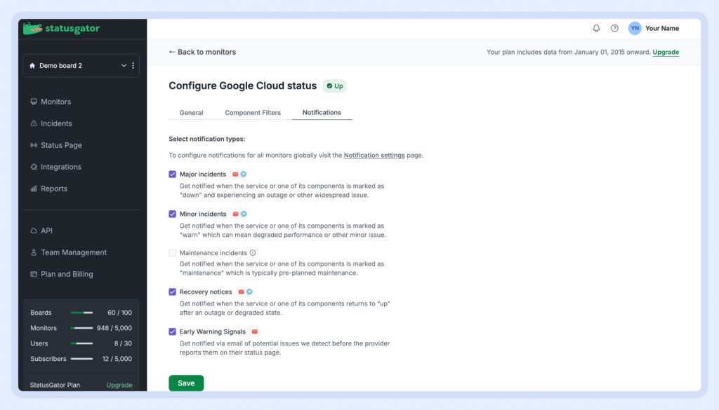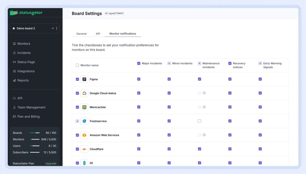 And if you’re managing multiple services, you can control notification preferences for all monitors in one place from your board settings. This makes it easy to apply consistent alerting rules across your entire setup without updating each monitor individually.