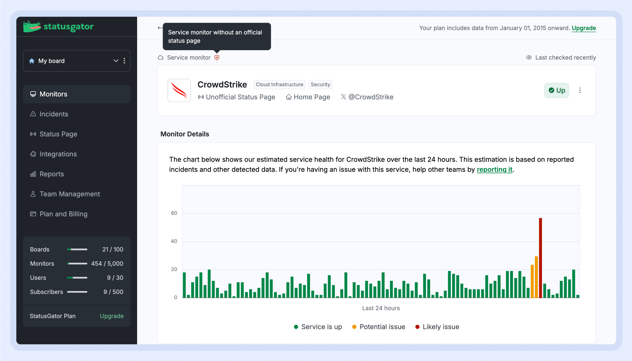 StatusGator now monitors services that lack an official status page, including hosted applications, ISPs, and many other types of services. How does it work? Our system estimates service health based on user-reported incidents and other detected data. If we suspect potential downtime, you’ll receive alerts to stay informed. Learn more here