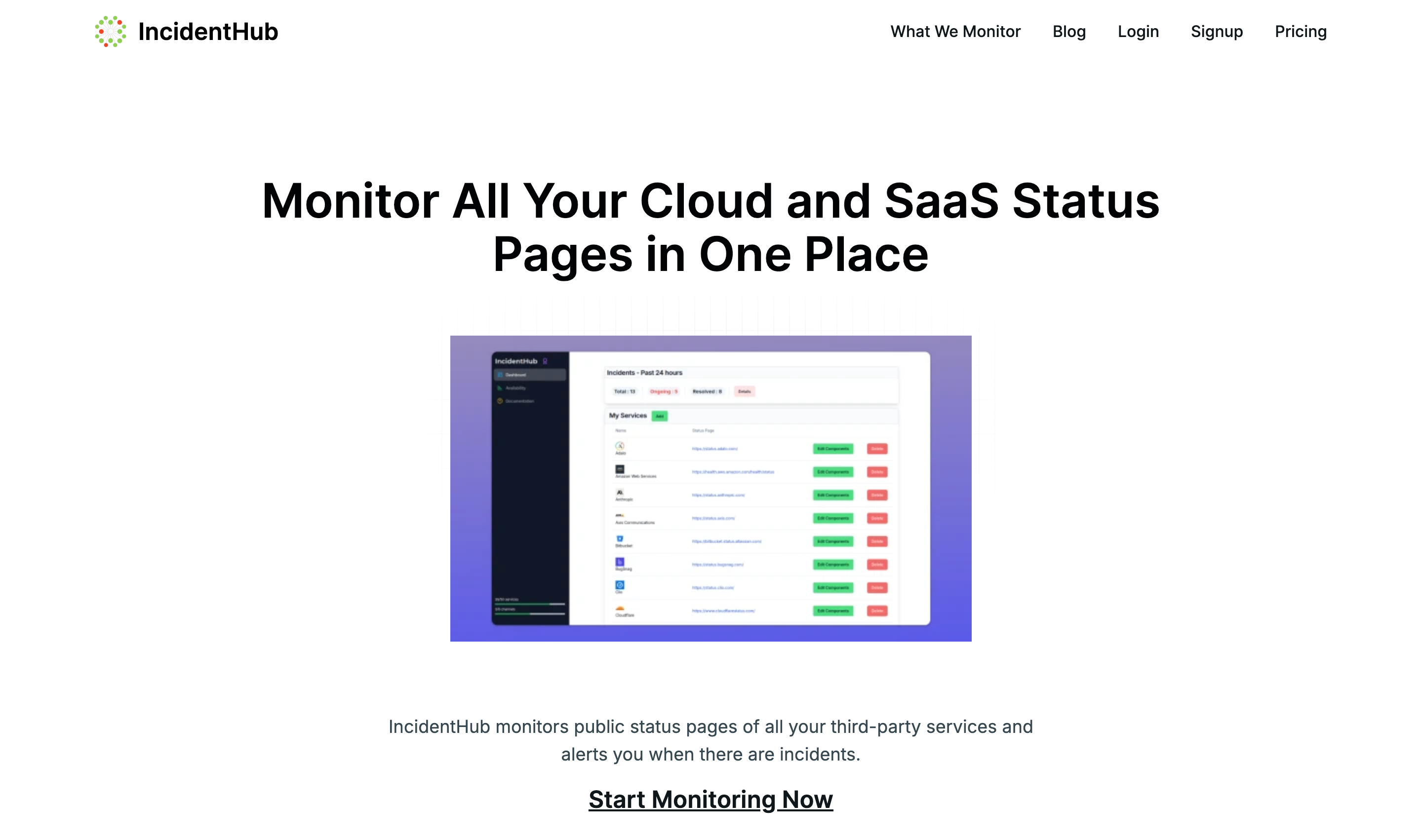 - Multi-Vendor Monitoring: Monitor hundreds of providers, including AWS, Google Cloud, Zoom, and GitHub.
